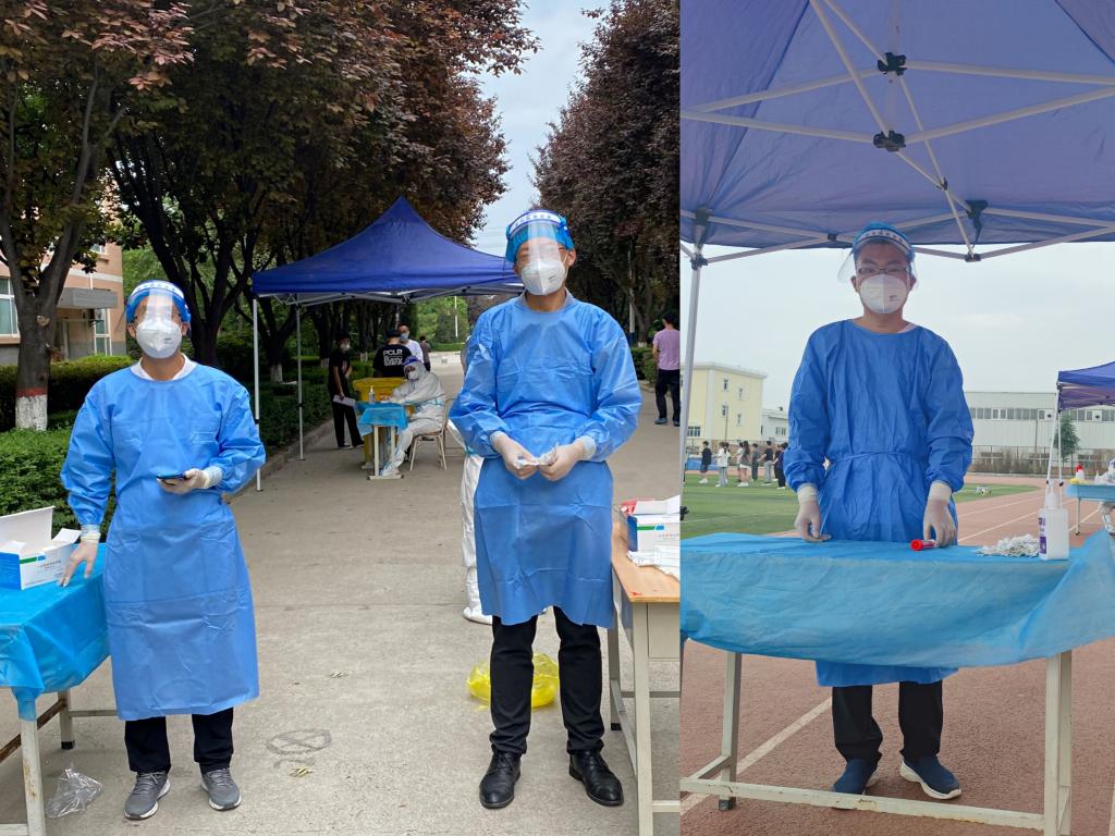 为落实疫情防控工作,积极响应学校号召,在5月25日的Beat365官网全员核酸检测工作中,Beat365官网教师张建华、余斌高、赵东平、李荣和李继广在各检测点协助进行核酸检测工作。
