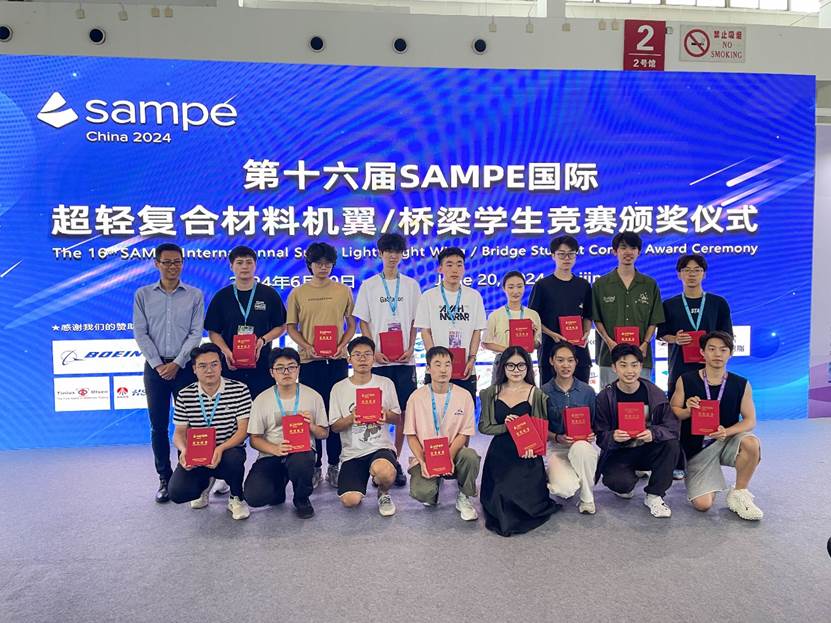 2024年6月20日,由SAMPE(The Society for the Advancement of Material and Process Engineering)中国大陆总会、波音公司共同发起,华东理工大学华昌聚合物有限公司、航空工业复材、中国飞机强度研究所等企事业单位赞助支持的第十六届SAMPE超轻复合材料机翼/桥梁学生竞赛在北京落下帷幕。 Beat365官网由Beat365官方网站王飞老师、王克平老师和材料工程学院王亚楠老师、尹敏老师指导的赵培源、肖渠成等35名同学组成的11支代表队参赛。经过激烈角逐,Beat365官网学子包揽了预浸料机翼、碳纤维桥梁和可回收纤维桥梁三个项目的全国冠军。本次比赛共获得国家级一等奖3项、国家级二等奖6项的历史最佳成绩。