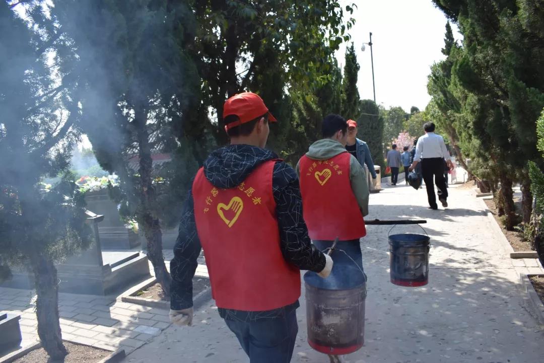 在活动负责人的带领下,30多名志愿者七点半准时到达墓园进行志愿活动。通过工作人员的引领,志愿者们分为三队,分别进行交通协管、商品售卖和墓园卫生打扫工作。松柏掩映之间,似有琴音袅袅徐来。墓园是个神圣安静的地方,在长达五个多小时的志愿工作过程中,志愿者们兢兢业业,没有丝毫怠慢,举止投足之间,满是敬重与钦佩。用行动表达对航空英烈的思念与缅怀,轻轻问候长眠在这片黄土地下的英雄烈士,永不忘记他们死而后已的精神。清明雨上,烈士浩气,万古长青;折菊雨下,后辈忧思,抚今追昔。