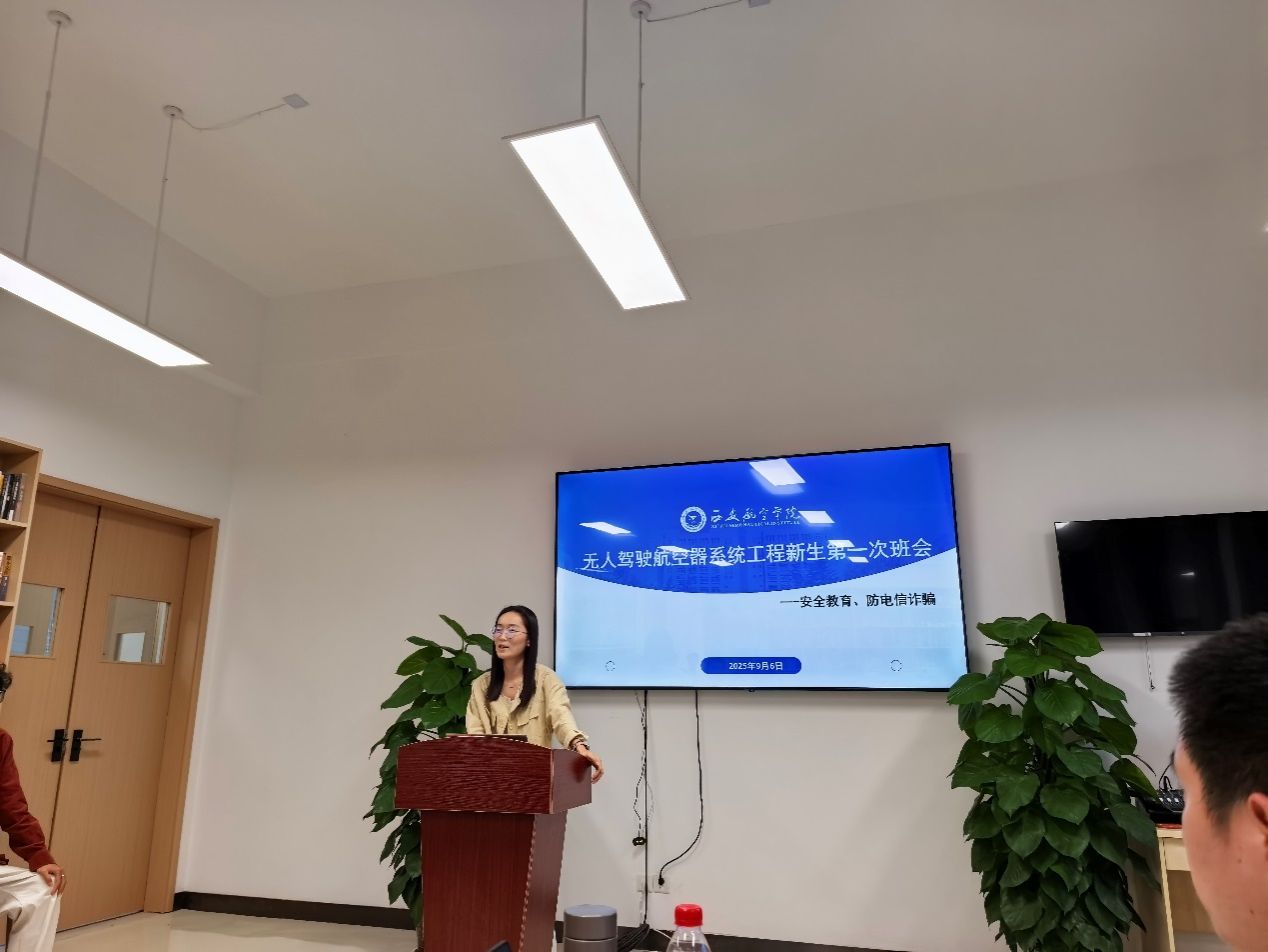 为帮助刚踏入大学校园的新生们提升安全防范意识,无人驾驶航空器系统工程 251 班于9月6日晚7点在民航二号楼实验室召开新生入学后的首次班会。本次班会以 “安全教育之警惕电信诈骗” 为核心主题,旨在认清电信诈骗的多样陷阱,为即将开启的大学生活筑牢 安全防线。专业负责人李继广老师、教研室主任屈高敏老师、班主任杨咪老师及学院办公室教学秘书乔奕华老师共同参与了此次班会。